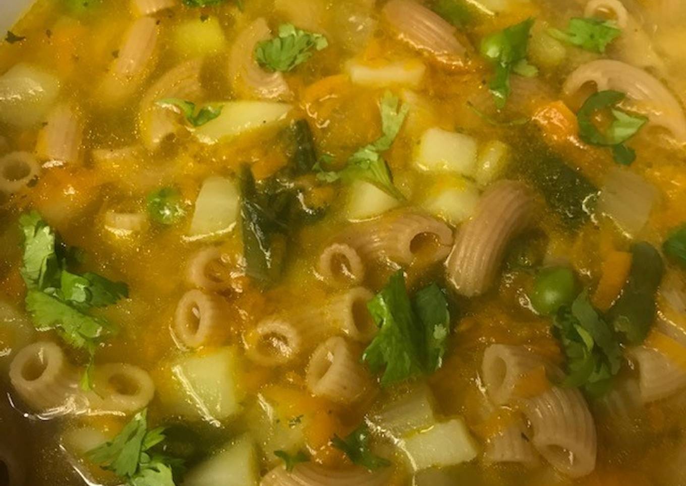 - Para hacerla ponemos en una cacerola 1 o 2 papas, 1 zanahoria rallada, 1 rama de apio quitadas las hebras y picada, un puño de ejotes congelados y un puño de chícharos congelados, cubrimos con agua, sazonamos con 3 cucharaditas de consomé; ponemos a dorar en aceite medio paquetito de una pasta para sopa tipo codito o caracolito, la escurrimos y la agregamos y dejamos que se cueza. Ya para servirla le ponemos un poco de cilantro picado por encima.