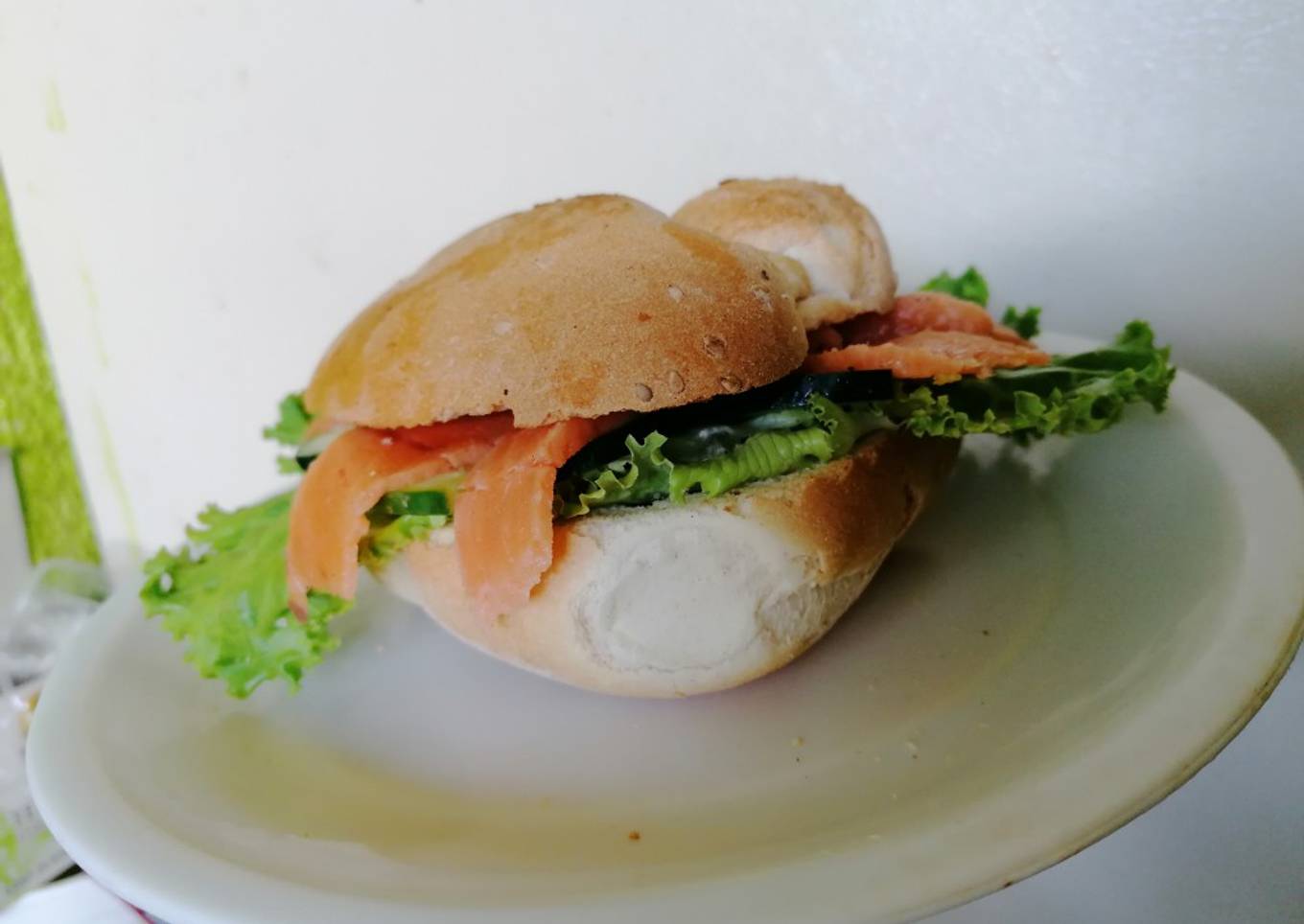 - Rebanar el pan, colocar un poco de mantequilla y llevar a calentar, preparar con medias lunas de pepino, cebolla morada, lechuga, aceitunas