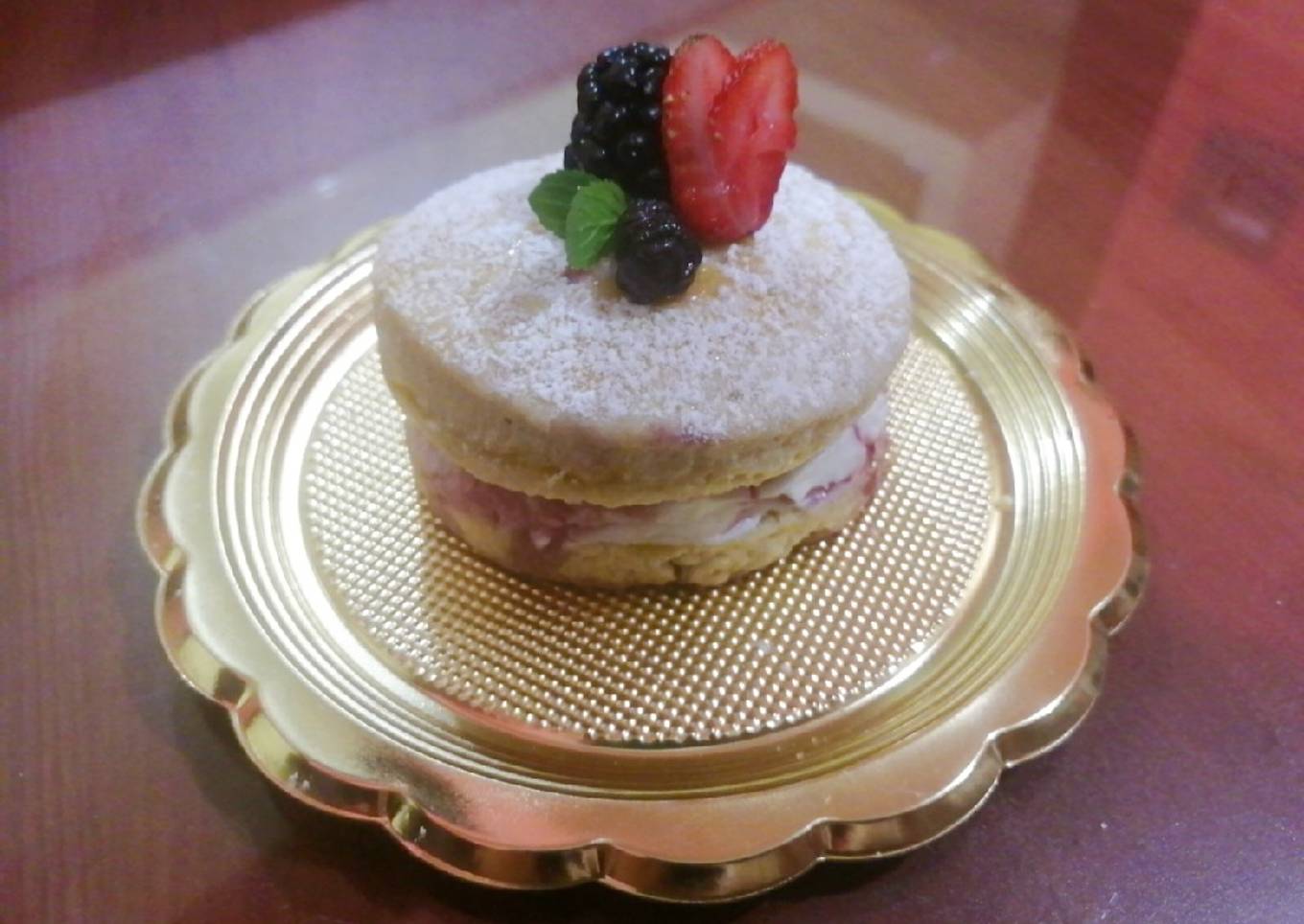 En la primera capa tiene la mermelada de frutos rojos y en la segunda queso Philadelphia.