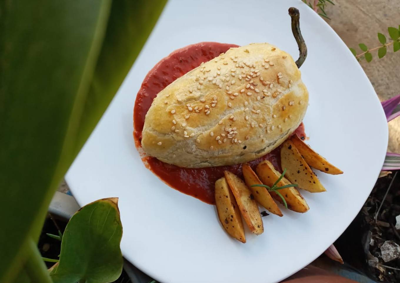 - Estiramos nuestra masa hojaldre, cortamos un triángulo y cubrimos el chile.