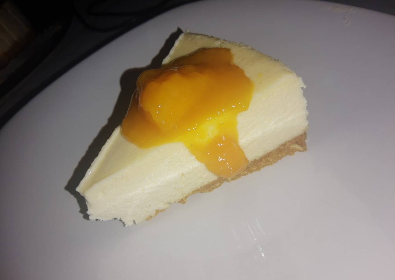 - Retire con cuidado la tarta de queso del molde desmontable y colóquela en un molde. Cubra con mermelada de mango y sirva.