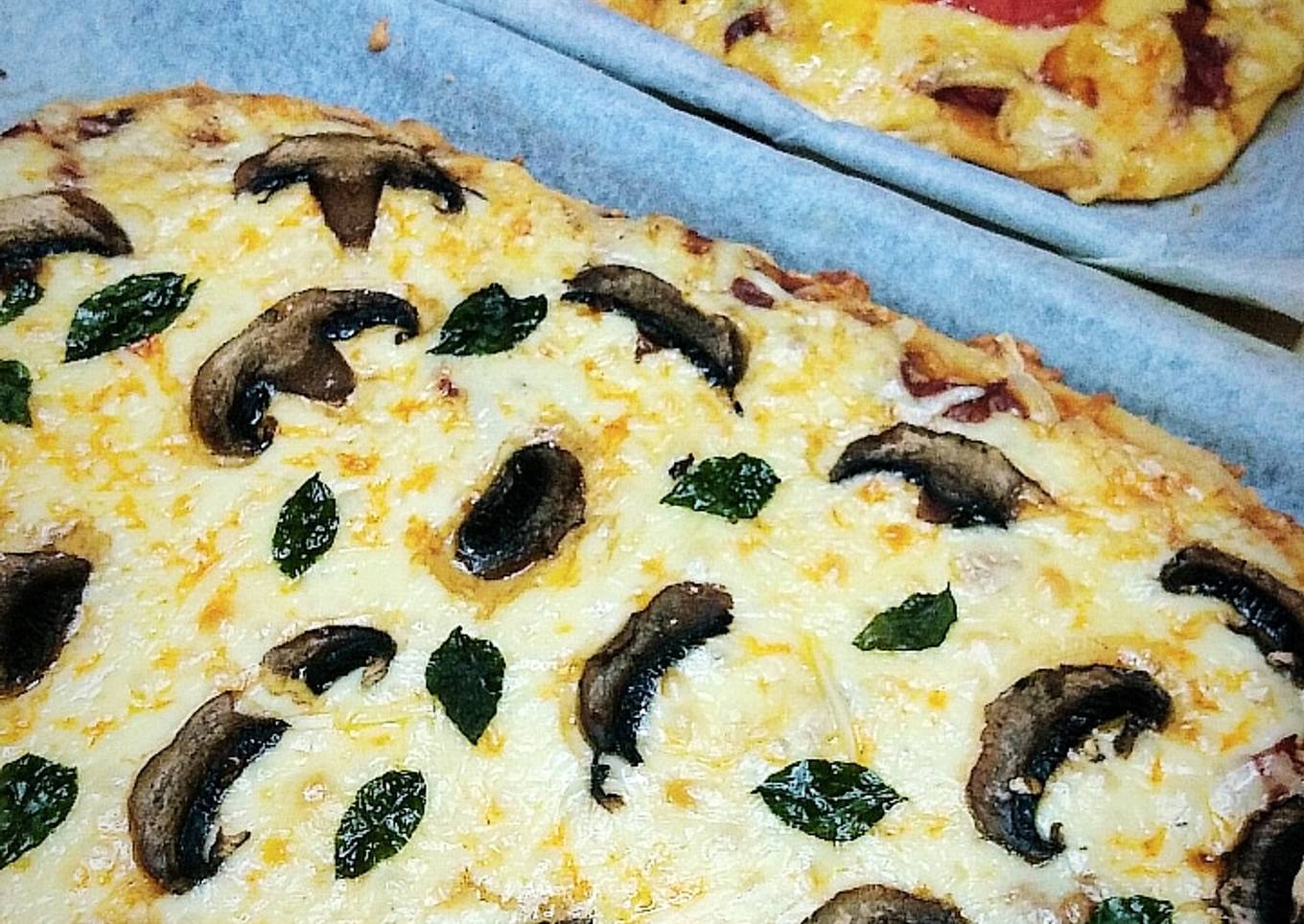 - Agregaremos nuestra salsa base y posteriormente los ingredientes de nuestra elección (en mi caso utilicé queso mozzarella y queso Chihuahua, champiñones, tomate y hojas de albahaca) las hojitas de albahaca recomiendo agregarlas 2 minutos antes de sacar la pizza del horno para evitar que se resequen.