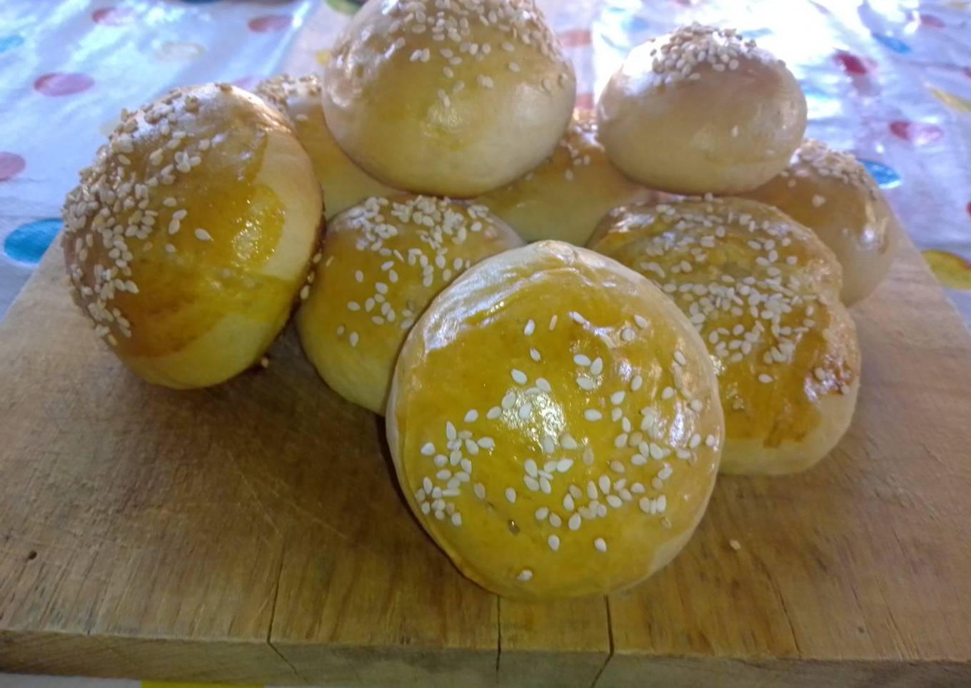- Dejamos reposar nuestros bollitos en una charola con papel estrella y barnizamos con huevo, agregamos ajonjolí al gusto.